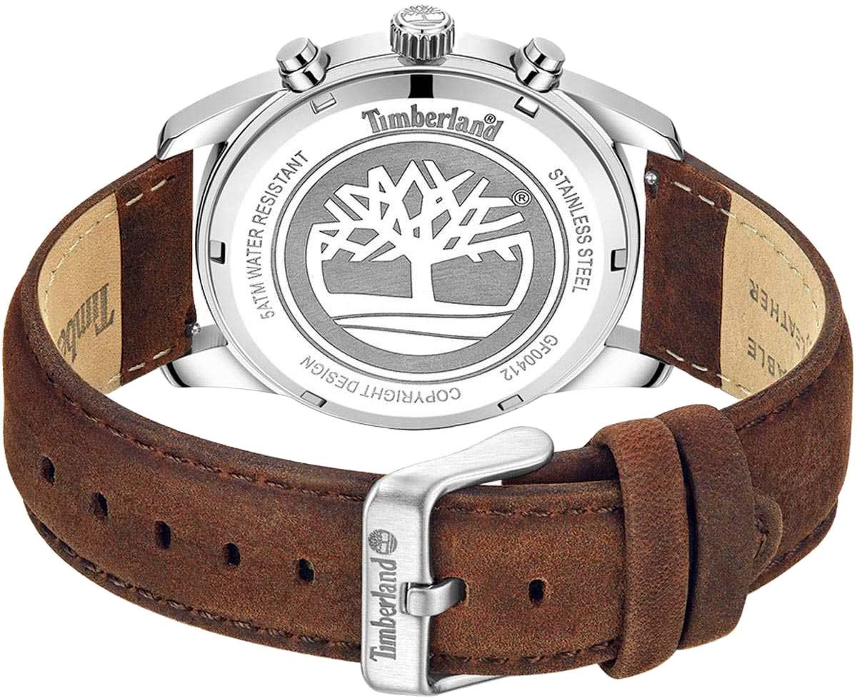 Американские мужские часы Timberland Northbridge TDWGF0041206 c хронографомХронографФункция позволяет измерять отрезки времени с особой точностью: часы, минуты, секунды. Верным признаком хронографа является наличие на циферблате 3 дополнительных окошек-счётчиков. имеют кварцевый механизм с высокой точностью. Класс водозащиты: 50 метров, позволит защитить корпус от случайных брызг или капель дождя. Корпус часов изготовлен из стали. Прочное минеральное стеклоМинеральное стеклоМинеральное стекло представляет собой искусственно выращенный минерал кварца. Такое стекло отличается особой устойчивостью к повреждениям и царапинам. Уступает по некоторым качествам сапфировому стеклу.. Стрелки c люминесцентным покрытиемЛюминесцентное покрытиеПозволяет считывать показания времени в темноте. Производители наносят на стрелки, часовые индексы, безель или поверхность циферблата светонакопительный состав, дающий холодное свечение.. Кожаный ремешок на стандартной застежке.