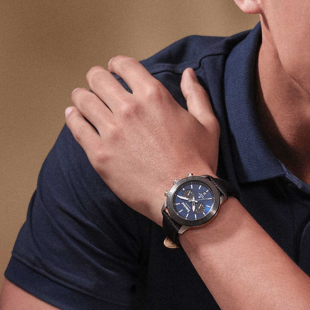 Американские мужские часы с тахиметромТахиметрРазмеченная шкала, располагается на ободке или безеле часов. Тахиметр позволяет рассчитать скорость на определённом участке пути, расстояние измеряется в километрах или милях. Timberland TDWGF0075101 — это сочетание надежности, функциональности и уверенного стиля. Модель идеально подойдет для тех, кто ценит точность и выносливость в каждой детали. Часы оснащены кварцевым механизмом , гарантирующим высокую точность хода и минимальное обслуживание. В конструкции использовано прочное минеральное стеклоМинеральное стеклоМинеральное стекло представляет собой искусственно выращенный минерал кварца. Такое стекло отличается особой устойчивостью к повреждениям и царапинам. Уступает по некоторым качествам сапфировому стеклу., устойчивое к мелким повреждениям и долговечное в использовании. Корпус выполнен из нержавеющей стали, что обеспечивает стойкость к царапинам и длительный срок службы без потери внешнего вида. Стрелки и метки часов имеют люминесцентное покрытиеЛюминесцентное покрытиеПозволяет считывать показания времени в темноте. Производители наносят на стрелки, часовые индексы, безель или поверхность циферблата светонакопительный состав, дающий холодное свечение., позволяющее считывать время даже в условиях слабого освещения. БезельБезельВнешний ободок, закрепляющий стекло. В спортивных часах так называется поворотное кольцо с делениями на циферблате, выполняет роль таймера – замеряет отрезки времени на шкале. Неподвижный безель – элемент декора. Однонаправленно вращающийся безель на дайверских часах позволяет фиксировать моменты погружения и выныривания на поверхность. с IP-покрытиемIP-покрытиеМетод ионного напыления. Демонстрирует повышенную устойчивость к истиранию, окислению и химическим веществам. Под воздействием высокого давления и температуры около 1500°C молекулы металла надёжно соединяются с частицами корпуса часов.. Дизайн дополнен кожаным ремешком с классической застежкой и системой быстрой замены , что делает использование часов максимально удобным и комфортным при ежедневной носке. Класс водозащиты WR50 позволяет использовать часы в повседневных условиях, включая мытьё рук или прогулки под дождем.