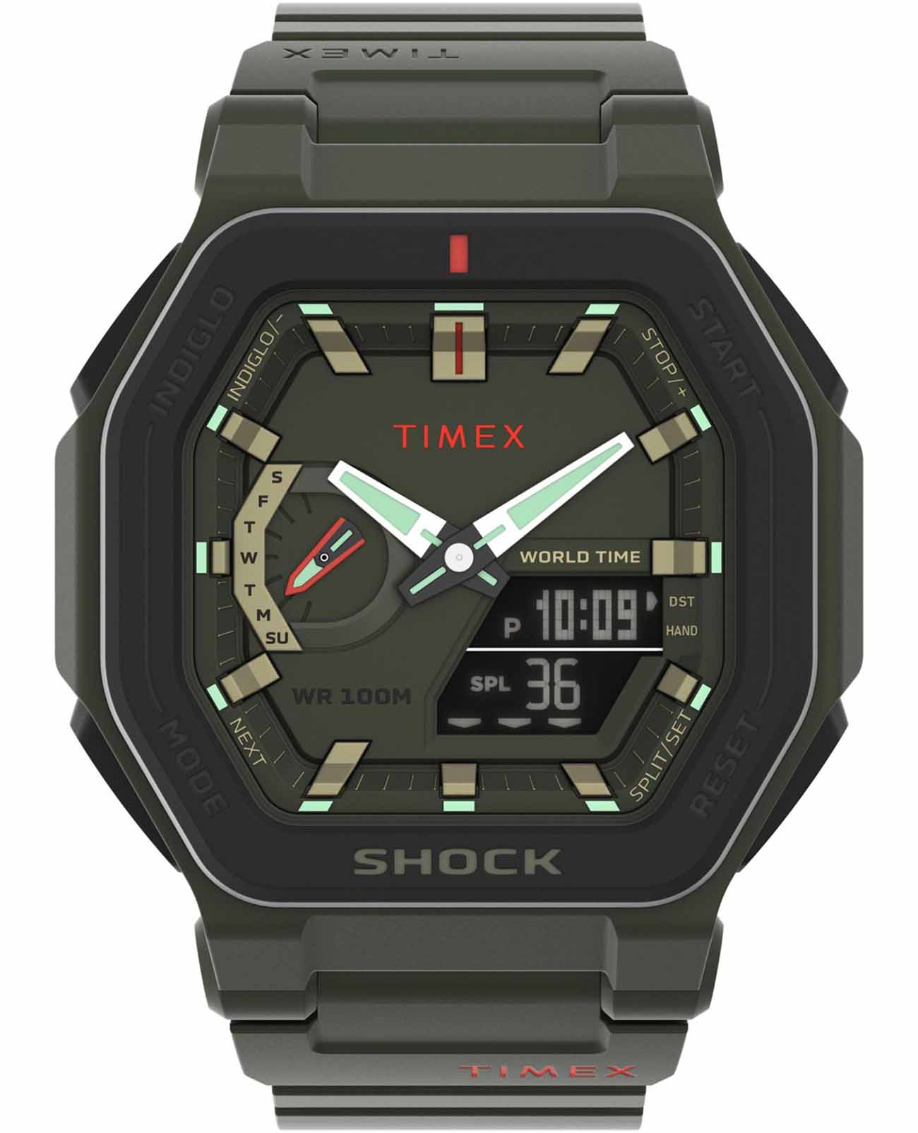 Часы Timex TW2V35400 — идеальный выбор для любителей активного образа жизни и приключений. Этот надежный аксессуар из США сочетает в себе передовые технологии и прочный дизайн. Кварцевый механизм обеспечивает точность хода, а корпус из прочного пластика делает часы легкими и удобными в ношении. Зеленый циферблат оснащен подсветкой Indiglo, а стрелки и метки с люминесцентным покрытиемЛюминесцентное покрытиеПозволяет считывать показания времени в темноте. Производители наносят на стрелки, часовые индексы, безель или поверхность циферблата светонакопительный состав, дающий холодное свечение. позволяют легко считывать время даже в темноте. Минеральное стеклоМинеральное стеклоМинеральное стекло представляет собой искусственно выращенный минерал кварца. Такое стекло отличается особой устойчивостью к повреждениям и царапинам. Уступает по некоторым качествам сапфировому стеклу. защищает циферблат от царапин и повреждений, а водозащита 100WR позволяет не беспокоиться о часах в условиях повышенной влажности или дождя. Эти часы оснащены множеством полезных функций, включая электронный SPLIT-хронографХронографФункция позволяет измерять отрезки времени с особой точностью: часы, минуты, секунды. Верным признаком хронографа является наличие на циферблате 3 дополнительных окошек-счётчиков. с секундомеромСекундомерСекундоме́р — прибор, способный измерять интервалы времени с точностью до долей секунды., таймерТаймерОтсчитывает секунды в обратном направлении в заданном интервале времени. обратного отсчета и мировое времяМировое время Полезное часовое усложнение, отображающее время в основных городах и известных областях по всему миру, оно связано с часовыми поясами, удобно для путешественников и бизнесменов. для 48 городов. Ретроградный указатель дня недели и календарь с отображением числа добавляют функциональности и удобства в повседневном использовании. Часы Timex TW2V35400 имеют прочный корпус с противоударной защитой и стальную заднюю крышку, которая крепится на 4-х винтах для дополнительной надежности. Пластиковый ремешок с классической застежкой обеспечивает комфортное ношение и надежную фиксацию на запястье. Эти часы станут отличным спутником в любых приключениях, предлагая стильный внешний вид и функциональность, необходимую для современного активного человека.