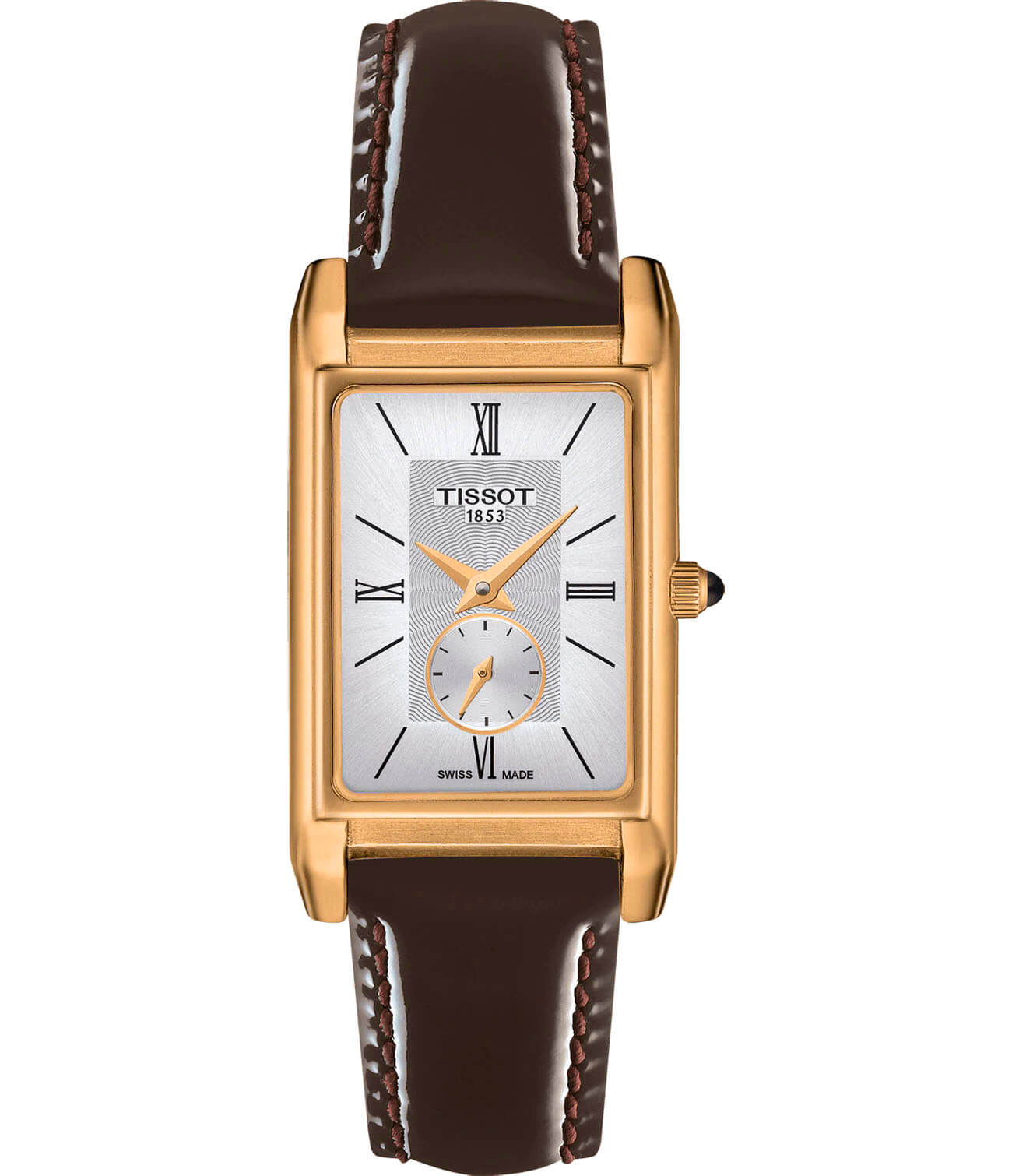 Прямоугольный светлый циферблат с римскими цифрами имеет оригинальную детализацию в центре, привлекательно смотрится миниатюрный секундный счётчик. Корпус сделан из 18-каратного золота18-каратное золотоОбозначение по каратной системе пробирования, оно показывает, сколько драгоценного металла содержится в изделии. 18 карат - в составе 75% чистого золота, соответствует 750 пробе.