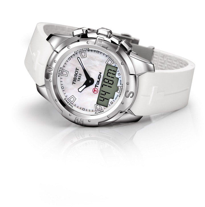 TISSOT T0472204711100 Touch Collection T-Touch II - женские кварцевые наручные часы Корпус этих часов среднего размера (427 мм) и выполнен из титана металлического цвета Модель TISSOT T0472204711100 Touch Collection T-Touch II имеет устойчивое к царапинам сапфировое стекло, ремешок из силикона белого цвета, перламутровый циферблат Калибр механизма: ETA E48311 Класс водозащиты: 100 м / 10 АТМ (разрешается плавание и ныряние без акваланга) Дополнительные функции и особенности: отображение числа, полностью автоматический календарь, второе время (GMT), будильник, хронограф (секундомер), таймер (обратный отсчет), барометр (атмосферное давление), альтиметр (высота над уровнем моря: зависит от показаний барометра), компас, сенсорный дисплей, термометр Полная заводская комплектация TISSOT: оригинальные часы, фирменная коробка, инструкция, сервисная книжка, роман о часовой фабрике, миникаталог, замшевый фирменный чехол черного цвета для хранения и/или переноски часов, кассовый и товарный чеки Международная гарантия 2 года Производство и сборка: Швейцария
