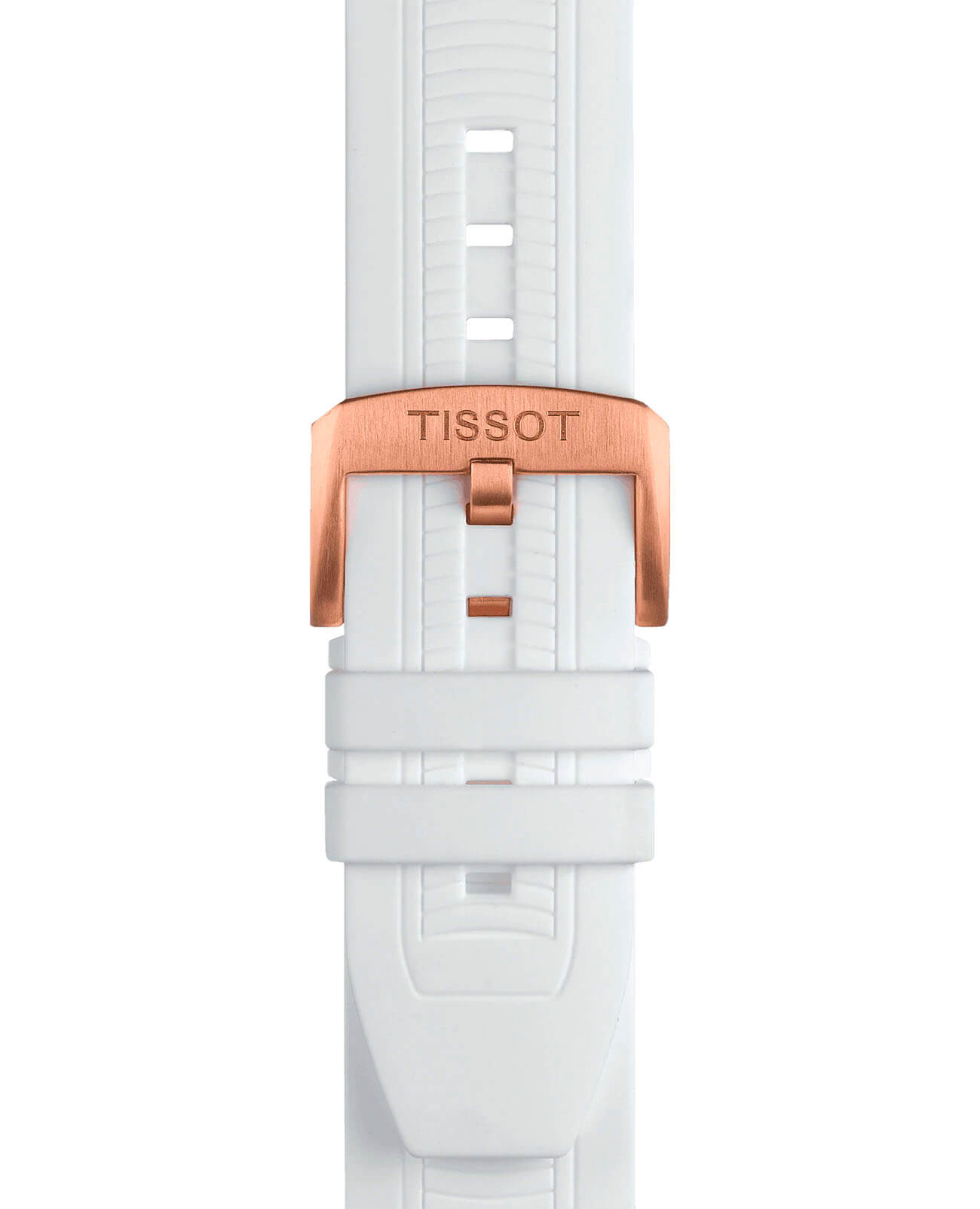 Бело-золотистый аксессуар выполнен в спортивном стиле, отдельные детали напоминают о гоночных мотоциклах: фигурный безельБезельВнешний ободок, закрепляющий стекло. В спортивных часах так называется поворотное кольцо с делениями на циферблате, выполняет роль таймера – замеряет отрезки времени на шкале. Неподвижный безель – элемент декора. Однонаправленно вращающийся безель на дайверских часах позволяет фиксировать моменты погружения и выныривания на поверхность. напоминает о тормозных дисках, необычная задняя крышка, крупные элементы, характерная апертура даты. Силиконовый ремешок доставляет комфорт при ношении и устойчив к износу. Кварцевый механизм ETA G10.212. Стекло из сапфира. PVD-покрытиеPVDУльтратонкое покрытие наносится в технике вакуумного напыления, сочетает в себе нитрид титана особой прочности со слоем золота или оксида хрома. Несёт в себе декоративную или защитную функцию. цвета розового золота. Люминесцентная подсветкаЛюминесцентное покрытиеПозволяет считывать показания времени в темноте. Производители наносят на стрелки, часовые индексы, безель или поверхность циферблата светонакопительный состав, дающий холодное свечение.. Водостойкость 100 метров. ХронографХронографФункция позволяет измерять отрезки времени с особой точностью: часы, минуты, секунды. Верным признаком хронографа является наличие на циферблате 3 дополнительных окошек-счётчиков., секундомер, тахиметрТахиметрРазмеченная шкала, располагается на ободке или безеле часов. Тахиметр позволяет рассчитать скорость на определённом участке пути, расстояние измеряется в километрах или милях.. Габариты: 47,6 x 43 x 12,3 мм.