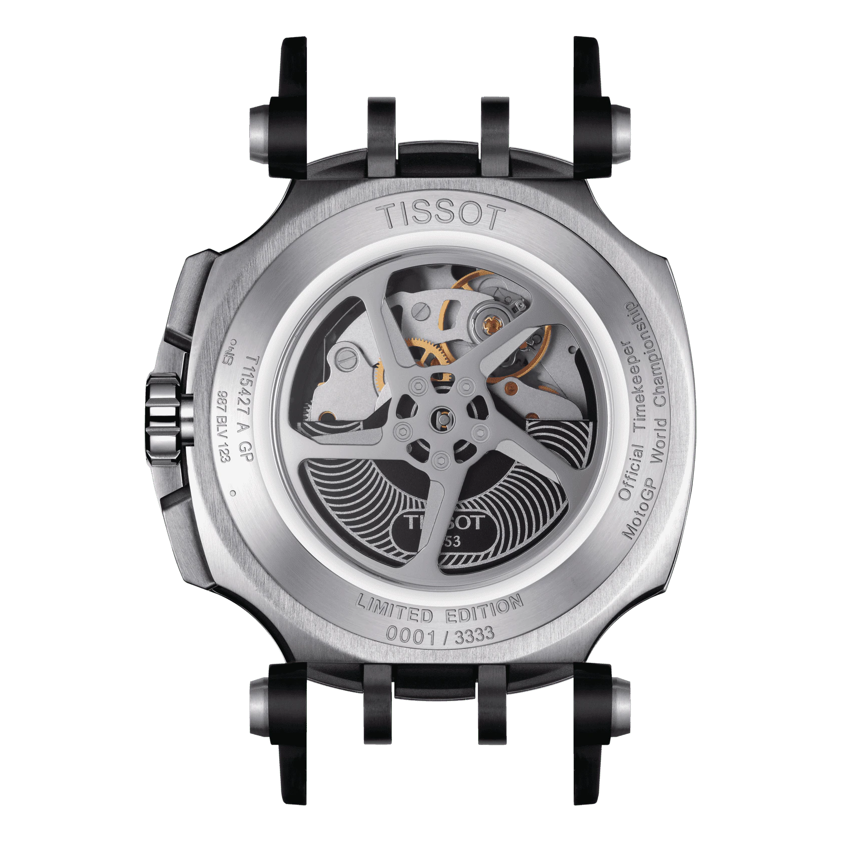 Лимитированный выпуск MotoGP (3333 экземпляра) Tissot T-Race MotoGP Automatic Chronograph Limited Edition T115.427.27.057.01, механический механизм (автоматический калибр) с высокой точностью. Сапфировое стекло устойчивое к появлению царапин, обладающее высокой прозрачностью. Класс водозащиты: 100 метров, позволит плавать, нырять и заниматься другими водными видами спорта. Корпус часов изготовлен из стали.