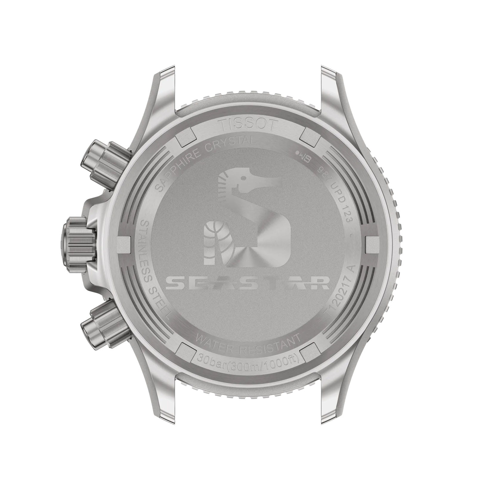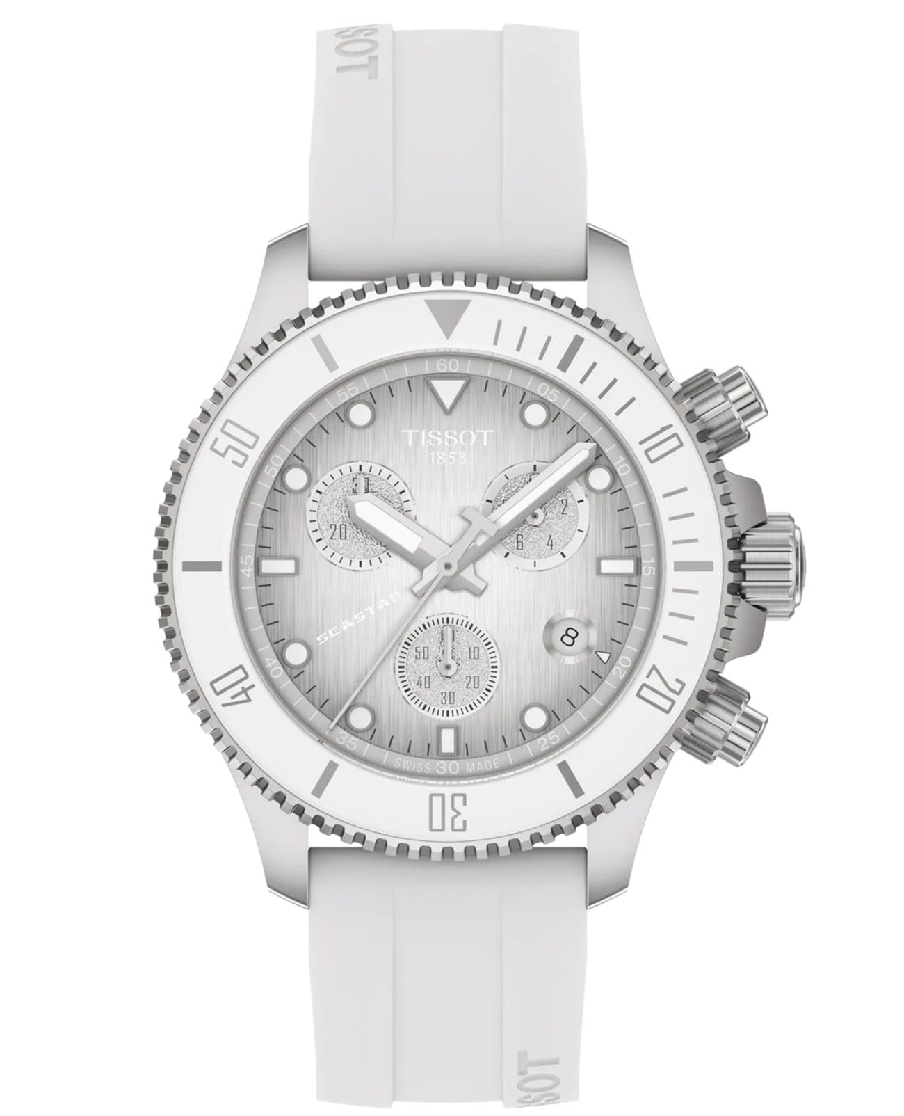 Tissot Seastar 1000 Quartz Chronograph T120.217.17.011.00 — компактный спортивный хронограф с дайверскими характеристиками. Корпус диаметром 38 мм изготовлен из нержавеющей стали и дополнен бело-серым градиентным циферблатом с перламутровым отливом. Безель — поворотный, с серым алюминиевым кольцом и 60-минутной шкалой. Циферблат защищён сапфировым стекломСапфировое стеклоПрочный и надёжный материал из кристалла сапфира синтетического происхождения, характеризующийся особой твёрдостью и устойчивостью к царапинам и повреждениям. с антибликовым покрытиемАнтибликовое покрытиеСлой оксида металла в 0,13-0,3 микрон, благодаря которому стекло часов не бликует и не отражает свет. Антибликовое покрытие уменьшает отражение света в 10 раз, обеспечивая отличную читаемость показателей циферблата.. Часовые метки и стрелки с люминесцентным покрытиемЛюминесцентное покрытиеПозволяет считывать показания времени в темноте. Производители наносят на стрелки, часовые индексы, безель или поверхность циферблата светонакопительный состав, дающий холодное свечение. обеспечивают читаемость даже в условиях плохого освещения. На циферблате расположены три счётчика: 1/10 секунды, 60 секунд и 30 минут. Также присутствует окно даты между «4» и «5 часами». Внутри установлен швейцарский кварцевый хронографХронографФункция позволяет измерять отрезки времени с особой точностью: часы, минуты, секунды. Верным признаком хронографа является наличие на циферблате 3 дополнительных окошек-счётчиков., обеспечивающий высокую точность и удобство использования. Модель укомплектована силиконовым белым ремешком с классической застёжкой. Водонепроницаемость до 300 метров делает Seastar 1000 идеальным спутником для плавания и водных видов спорта. Tissot Seastar T120.217.17.011.00 — утончённый дайверский хронограф с профессиональной функциональностью и стильным внешним видом.