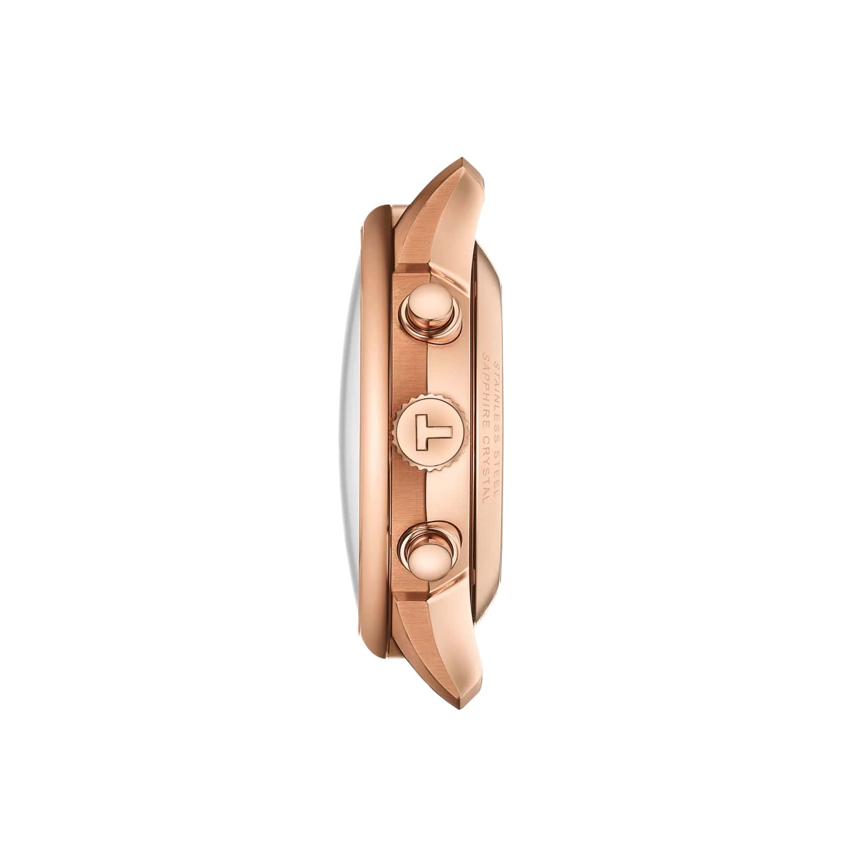 Tissot Chemin des Tourelles Automatic Chronograph (модель T139.462.36.298.00) – это элегантность и технологичность в одном аксессуаре. Корпус диаметром 42 мм выполнен из нержавеющей стали 316L с изысканным PVD-покрытиемPVDУльтратонкое покрытие наносится в технике вакуумного напыления, сочетает в себе нитрид титана особой прочности со слоем золота или оксида хрома. Несёт в себе декоративную или защитную функцию. в цвете розового золота, подчёркивающим статусность модели. Коричневый циферблат с римскими цифрами дополнен классическими стрелками, а его поверхность защищена сапфировым стекломСапфировое стеклоПрочный и надёжный материал из кристалла сапфира синтетического происхождения, характеризующийся особой твёрдостью и устойчивостью к царапинам и повреждениям. с антибликовым покрытиемАнтибликовое покрытиеСлой оксида металла в 0,13-0,3 микрон, благодаря которому стекло часов не бликует и не отражает свет. Антибликовое покрытие уменьшает отражение света в 10 раз, обеспечивая отличную читаемость показателей циферблата., обеспечивающим идеальную читаемость при любом освещении. Внутри скрывается надёжный автоматический калибр ValjouxValjouxПремиальный калибр от швейцарской компании ETA c уникальной отделкой механизма. Отличается увеличенным запасом хода от 45 до 60 часов, в зависимости от калибра, точность хода составляет +/- 5 секунд в сутки. с 68-часовым запасом хода. Функциональность модели дополняет хронографХронографФункция позволяет измерять отрезки времени с особой точностью: часы, минуты, секунды. Верным признаком хронографа является наличие на циферблате 3 дополнительных окошек-счётчиков. с 12-часовым, 30-минутным и 60-секундным счётчиками, а также центральной секундной стрелкой. Браслет из коричневой кожи завершает образ, а надёжная застёжка 'бабочка'Застёжка "бабочка"Такой вид застёжки дополняется предохранителями, помогающими избежать случайного раскрытия браслета. Обладают изящным исполнением. обеспечивает комфортное ношение. Водонепроницаемость 5 бар (50 метров) делает модель устойчивой к случайным брызгам и дождю.