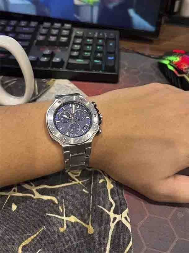 Стильное оформление корпуса выгодно подчеркнет повседневный образ. Высокая точность хода обусловлена наличием швейцарского кварцевого калибра ETA G10.212. Сапфировое стеклоСапфировое стеклоПрочный и надёжный материал из кристалла сапфира синтетического происхождения, характеризующийся особой твёрдостью и устойчивостью к царапинам и повреждениям. с антибликовым покрытием. Литой браслет из нержавеющей стали. Люминесцентная подсветкаЛюминесцентное покрытиеПозволяет считывать показания времени в темноте. Производители наносят на стрелки, часовые индексы, безель или поверхность циферблата светонакопительный состав, дающий холодное свечение. стрелок и меток. Корпус из нержавеющей стали. Водостойкость 100 метров. Секундомер, тахиметрТахиметрРазмеченная шкала, располагается на ободке или безеле часов. Тахиметр позволяет рассчитать скорость на определённом участке пути, расстояние измеряется в километрах или милях., индикация числа. Габариты: 45 x 45 x 11,8 мм.