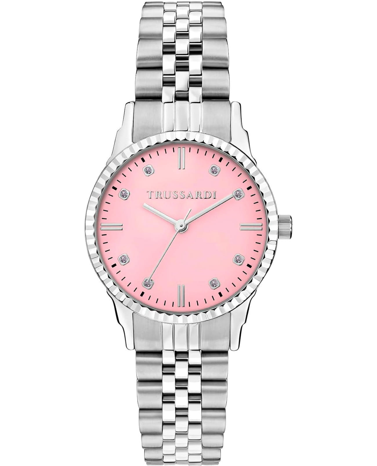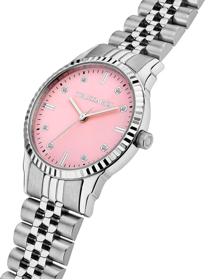 Итальянские женские часы Trussardi T-Bent R2453144510 - это стильный женский аксессуар, который сочетает элегантный дизайн и практичность. Корпус выполнен из нержавеющей стали, что обеспечивает долговечность и утончённый внешний вид. БезельБезельВнешний ободок, закрепляющий стекло. В спортивных часах так называется поворотное кольцо с делениями на циферблате, выполняет роль таймера – замеряет отрезки времени на шкале. Неподвижный безель – элемент декора. Однонаправленно вращающийся безель на дайверских часах позволяет фиксировать моменты погружения и выныривания на поверхность. с алмазной гранью. Надежное минеральное стеклоМинеральное стеклоМинеральное стекло представляет собой искусственно выращенный минерал кварца. Такое стекло отличается особой устойчивостью к повреждениям и царапинам. Уступает по некоторым качествам сапфировому стеклу. защищает циферблат с кристаллами от царапин и обеспечивает долговечность. Модель оснащена кварцевым механизмом, обеспечивающим высокую точность хода. Браслет из нержавеющей стали на раскладной застёжкеРаскладная застёжкаТакой тип застёжки используется только на браслетах из металла. Она никогда не раскрывается полностью, происходит разделение на 2 и более частей. Раскладывающая застёжка снизит вероятность потери часов к минимуму. обеспечивает комфортное ношение. Водозащита 50 метров позволит защитить корпус от случайных брызг или капель дождя. Эта модель – отличный выбор для тех, кто ищет сочетание стиля, качества и функциональности. Часы станут не только полезным аксессуаром, но и выразительным элементом вашего имиджа.