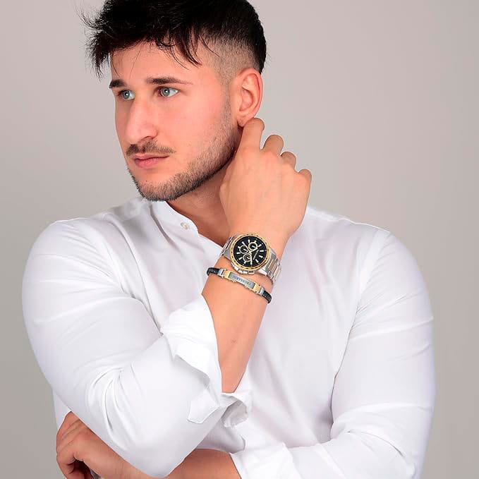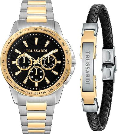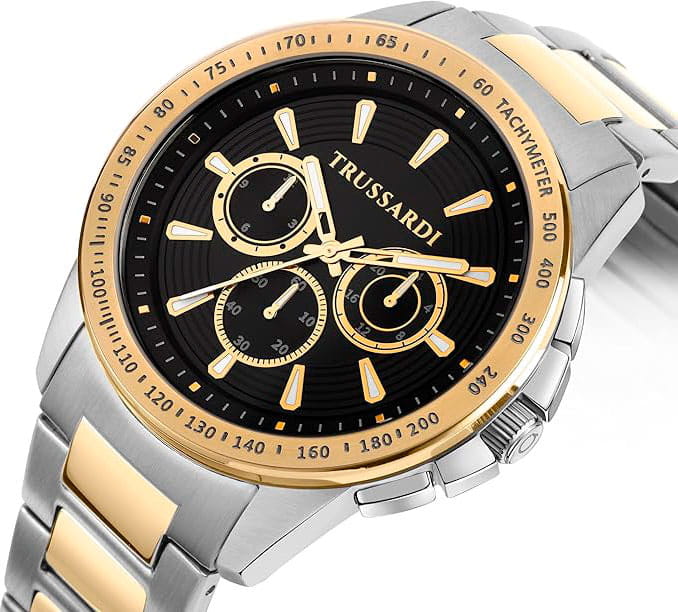Итальянские мужские часы Trussardi T-Hawk R2453153001 - это стильный мужской аксессуар, который сочетает элегантный дизайн и практичность. Корпус выполнен из нержавеющей стали с безелемБезельВнешний ободок, закрепляющий стекло. В спортивных часах так называется поворотное кольцо с делениями на циферблате, выполняет роль таймера – замеряет отрезки времени на шкале. Неподвижный безель – элемент декора. Однонаправленно вращающийся безель на дайверских часах позволяет фиксировать моменты погружения и выныривания на поверхность. с IP-покрытиемIP-покрытиеМетод ионного напыления. Демонстрирует повышенную устойчивость к истиранию, окислению и химическим веществам. Под воздействием высокого давления и температуры около 1500°C молекулы металла надёжно соединяются с частицами корпуса часов., что обеспечивает долговечность и утончённый внешний вид. Шкала тахиметраТахиметрРазмеченная шкала, располагается на ободке или безеле часов. Тахиметр позволяет рассчитать скорость на определённом участке пути, расстояние измеряется в километрах или милях. на безелеБезельВнешний ободок, закрепляющий стекло. В спортивных часах так называется поворотное кольцо с делениями на циферблате, выполняет роль таймера – замеряет отрезки времени на шкале. Неподвижный безель – элемент декора. Однонаправленно вращающийся безель на дайверских часах позволяет фиксировать моменты погружения и выныривания на поверхность.. Надежное минеральное стеклоМинеральное стеклоМинеральное стекло представляет собой искусственно выращенный минерал кварца. Такое стекло отличается особой устойчивостью к повреждениям и царапинам. Уступает по некоторым качествам сапфировому стеклу. защищает циферблат от царапин и обеспечивает долговечность. Модель оснащена кварцевым механизмом, обеспечивающим высокую точность хода. Браслет из нержавеющей стали с частичяным IP-покрытиемIP-покрытиеМетод ионного напыления. Демонстрирует повышенную устойчивость к истиранию, окислению и химическим веществам. Под воздействием высокого давления и температуры около 1500°C молекулы металла надёжно соединяются с частицами корпуса часов. с раскладной застёжкойРаскладная застёжкаТакой тип застёжки используется только на браслетах из металла. Она никогда не раскрывается полностью, происходит разделение на 2 и более частей. Раскладывающая застёжка снизит вероятность потери часов к минимуму. обеспечивает комфортное ношение. Водозащита 50 метров позволит защитить корпус от случайных брызг или капель дождя. Вынесенный циферблат с 24-х и 12- ти часовым указателем времени, а также вынесенный циферблат с хронографомХронографФункция позволяет измерять отрезки времени с особой точностью: часы, минуты, секунды. Верным признаком хронографа является наличие на циферблате 3 дополнительных окошек-счётчиков.. Стрелки и метки оснащены люминесцентным покрытиемЛюминесцентное покрытиеПозволяет считывать показания времени в темноте. Производители наносят на стрелки, часовые индексы, безель или поверхность циферблата светонакопительный состав, дающий холодное свечение., обеспечивающим отличную видимость даже при слабом освещении. Эта модель – отличный выбор для тех, кто ищет сочетание стиля, качества и функциональности. Часы станут не только полезным аксессуаром, но и выразительным элементом ваше