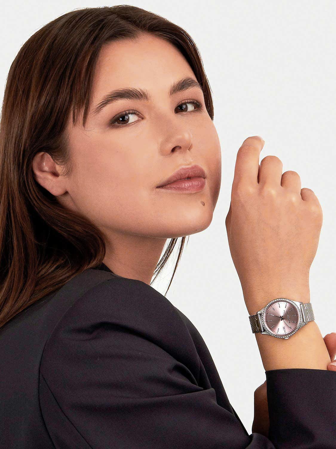 Итальянские женские часы Trussardi T-Vision R2453170506 - это стильный женский аксессуар, который сочетает элегантный дизайн и практичность. Корпус выполнен из нержавеющей стали, что обеспечивает долговечность и утончённый внешний вид. Надежное минеральное стеклоМинеральное стеклоМинеральное стекло представляет собой искусственно выращенный минерал кварца. Такое стекло отличается особой устойчивостью к повреждениям и царапинам. Уступает по некоторым качествам сапфировому стеклу. защищает циферблат от царапин и обеспечивает долговечность. Корпус и циферблат украшены кристаллами. Модель оснащена кварцевым механизмом, обеспечивающим высокую точность хода. Окошко даты в положении 3 часов. Браслет из нержавеющей стали с раскладным замкомРаскладной замокДанный вариант застежки используется только на часах с металлическим браслетом. Отличительная особенность такого крепления в том, что длина браслета становится универсальной и вы можете самостоятельно отрегулировать нужный вам размер – застежка просто двигается по браслету часов. обеспечивает комфортное ношение. Стрелки оснащены люминесцентным покрытиемЛюминесцентное покрытиеПозволяет считывать показания времени в темноте. Производители наносят на стрелки, часовые индексы, безель или поверхность циферблата светонакопительный состав, дающий холодное свечение., обеспечивающим отличную видимость даже при слабом освещении. Водозащита 50 метров позволит защитить корпус от случайных брызг или капель дождя. Эта модель – отличный выбор для тех, кто ищет сочетание стиля, качества и функциональности. Часы станут не только полезным аксессуаром, но и выразительным элементом вашего имиджа.
