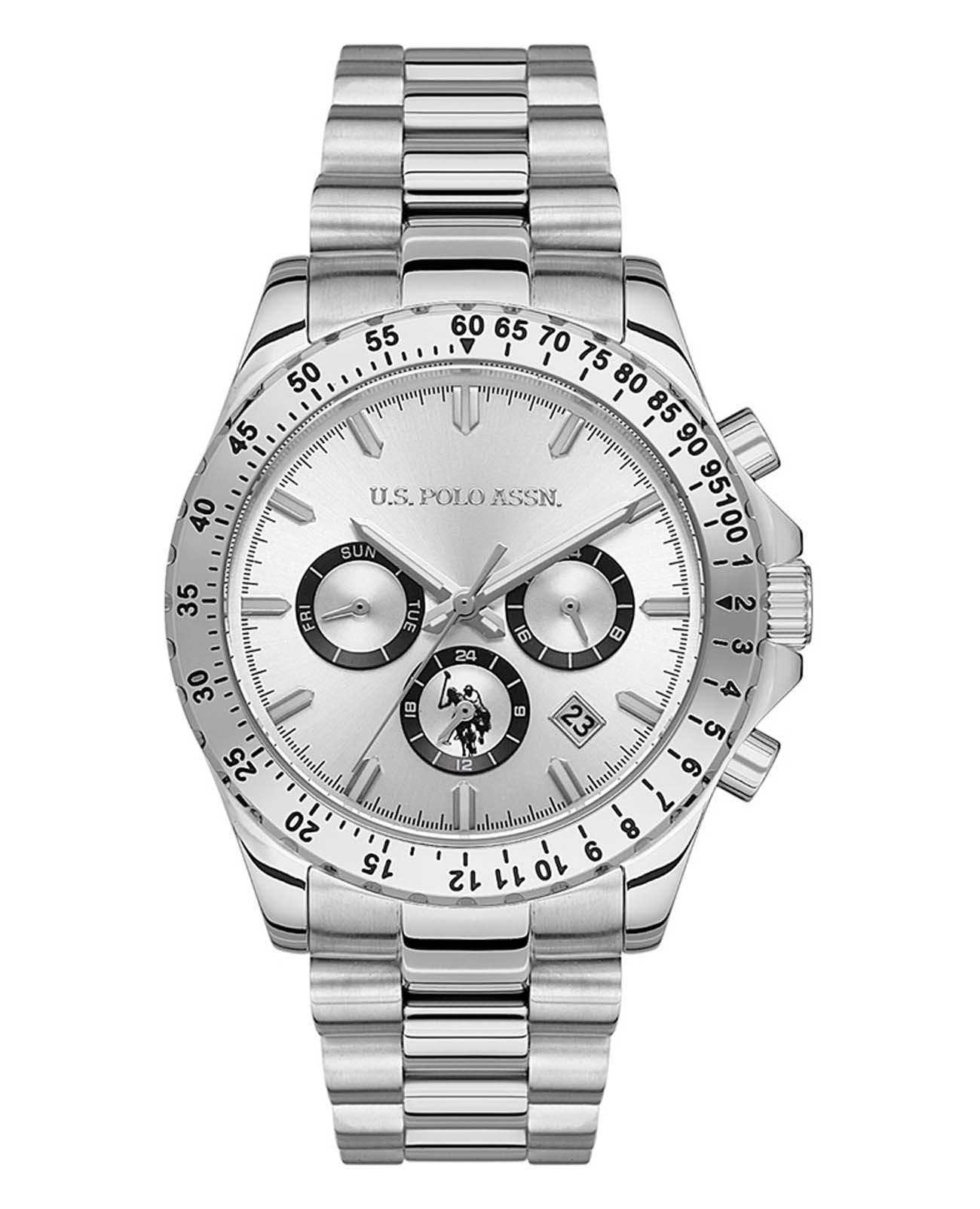 Мужские часы U.S. Polo Assn. Crossing USPA1052-02, кварцевый механизм с высокой точностью. Минеральное стеклоМинеральное стеклоМинеральное стекло представляет собой искусственно выращенный минерал кварца. Такое стекло отличается особой устойчивостью к повреждениям и царапинам. Уступает по некоторым качествам сапфировому стеклу. устойчивое к появлению царапин, обладающее высокой прозрачностью. Корпус изготовлен из нержавеющей стали. Центральные часовая, минутная и секундная стрелки. Индикация даты и дня недели. Второй часовой пояс в 24х часовом формате. Стрелки и метки с люминесцентным покрытиемЛюминесцентное покрытиеПозволяет считывать показания времени в темноте. Производители наносят на стрелки, часовые индексы, безель или поверхность циферблата светонакопительный состав, дающий холодное свечение.. Окошко даты находится в положении между 4 и 5 часами. Класс водозащиты: 50 метров, позволит защитить корпус от случайных брызг или капель дождя. Стальной браслет на застёжке-бабочкеЗастёжка "бабочка"Такой вид застёжки дополняется предохранителями, помогающими избежать случайного раскрытия браслета. Обладают изящным исполнением. .