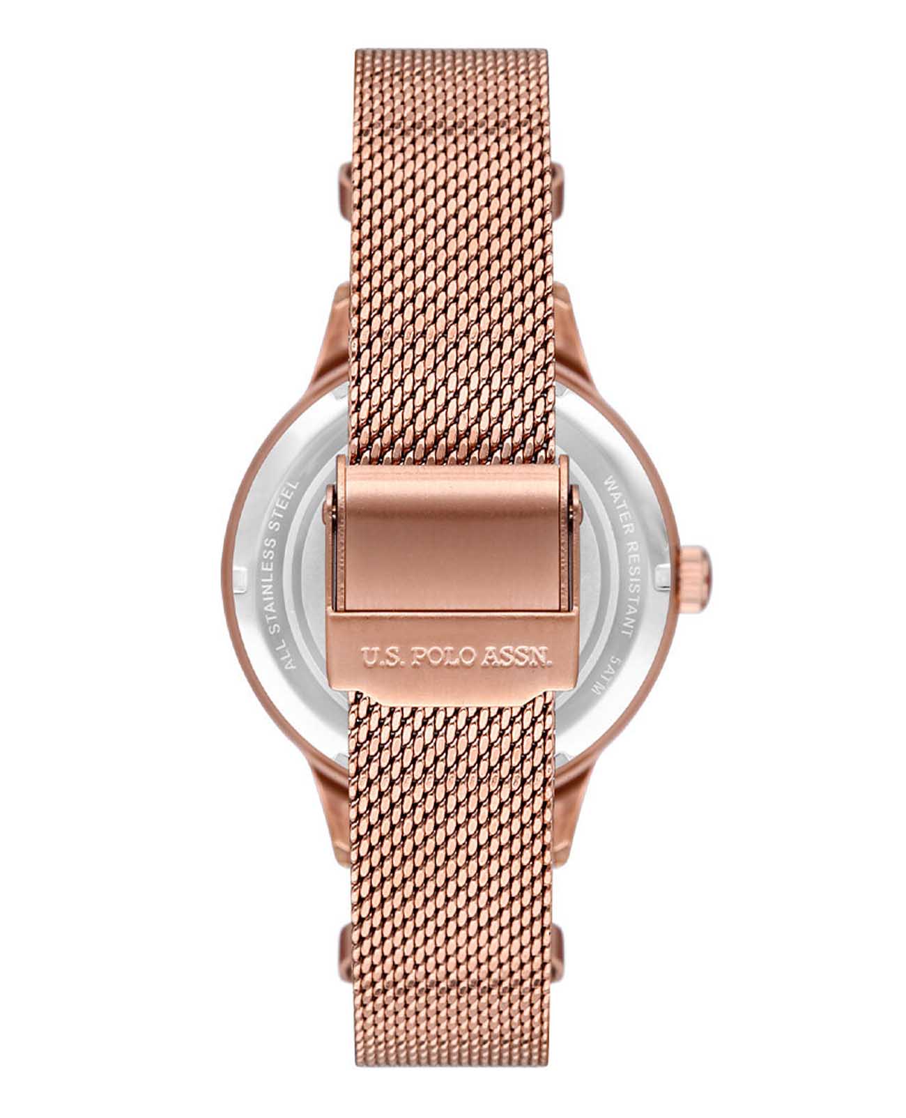 Женские часы U.S. Polo Assn USPA2010-01, кварцевый механизм с высокой точностью. Минеральное стеклоМинеральное стеклоМинеральное стекло представляет собой искусственно выращенный минерал кварца. Такое стекло отличается особой устойчивостью к повреждениям и царапинам. Уступает по некоторым качествам сапфировому стеклу. устойчивое к появлению царапин, обладающее высокой прозрачностью. Корпус изготовлен из нержавеющей стали с IP-покрытиемIP-покрытиеМетод ионного напыления. Демонстрирует повышенную устойчивость к истиранию, окислению и химическим веществам. Под воздействием высокого давления и температуры около 1500°C молекулы металла надёжно соединяются с частицами корпуса часов.. 24-х часовой формат времени, окошко даты и дня недели вынесены на отдельный циферблат. Класс водозащиты: 50 метров, позволит защитить корпус от случайных брызг или капель дождя. Стальной браслет миланского плетения с IP-покрытиемIP-покрытиеМетод ионного напыления. Демонстрирует повышенную устойчивость к истиранию, окислению и химическим веществам. Под воздействием высокого давления и температуры около 1500°C молекулы металла надёжно соединяются с частицами корпуса часов. на раскладном замкеРаскладной замокДанный вариант застежки используется только на часах с металлическим браслетом. Отличительная особенность такого крепления в том, что длина браслета становится универсальной и вы можете самостоятельно отрегулировать нужный вам размер – застежка просто двигается по браслету часов..