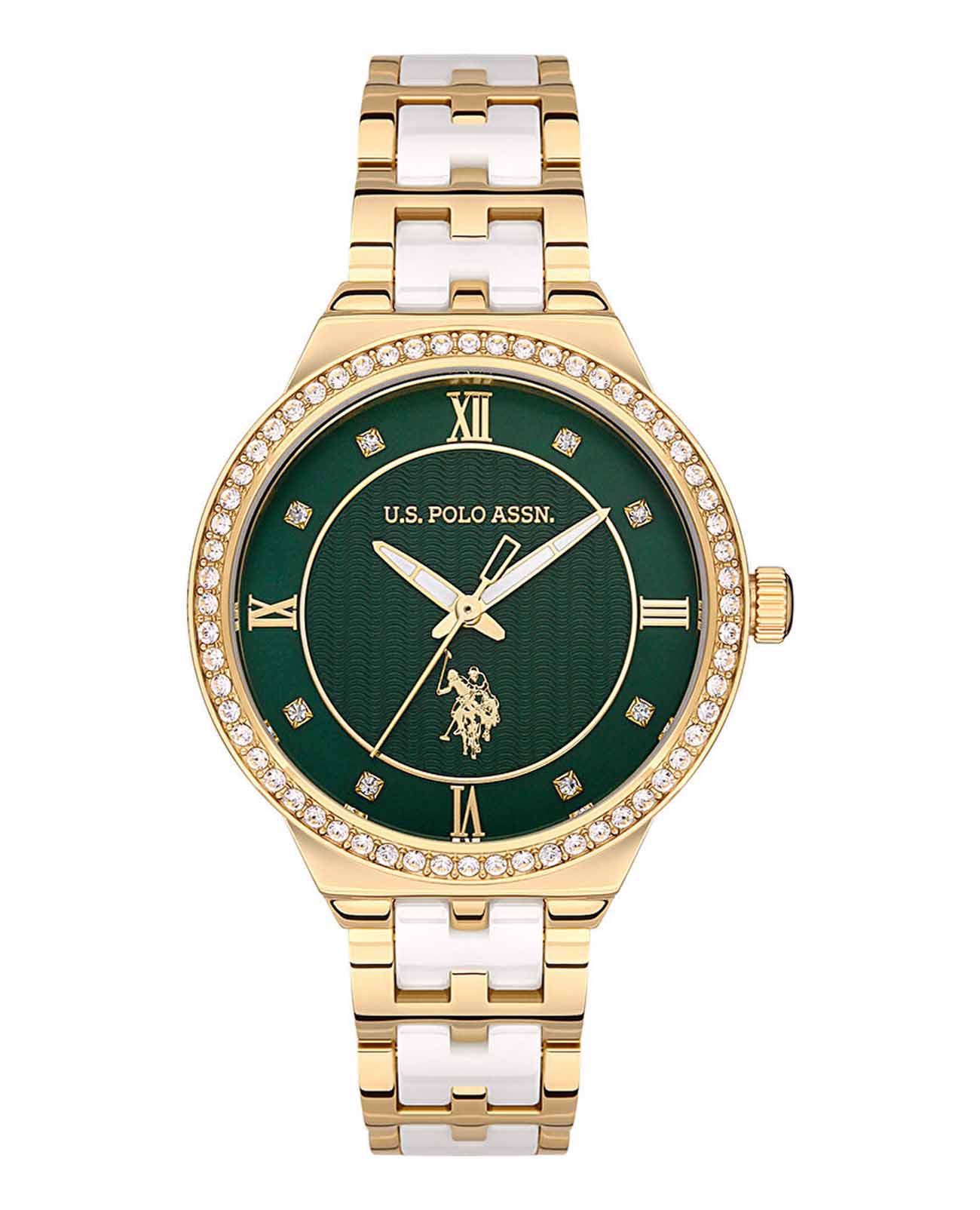 Женские часы U.S. Polo Assn Stile USPA2058-02, кварцевый механизм с высокой точностью. Минеральное стеклоМинеральное стеклоМинеральное стекло представляет собой искусственно выращенный минерал кварца. Такое стекло отличается особой устойчивостью к повреждениям и царапинам. Уступает по некоторым качествам сапфировому стеклу. устойчивое к появлению царапин, обладающее высокой прозрачностью. Корпус изготовлен из нержавеющей стали с IP-покрытиемIP-покрытиеМетод ионного напыления. Демонстрирует повышенную устойчивость к истиранию, окислению и химическим веществам. Под воздействием высокого давления и температуры около 1500°C молекулы металла надёжно соединяются с частицами корпуса часов.. БезельБезельВнешний ободок, закрепляющий стекло. В спортивных часах так называется поворотное кольцо с делениями на циферблате, выполняет роль таймера – замеряет отрезки времени на шкале. Неподвижный безель – элемент декора. Однонаправленно вращающийся безель на дайверских часах позволяет фиксировать моменты погружения и выныривания на поверхность. украшен кристаллами. Стрелки с люминесцентным покрытиемЛюминесцентное покрытиеПозволяет считывать показания времени в темноте. Производители наносят на стрелки, часовые индексы, безель или поверхность циферблата светонакопительный состав, дающий холодное свечение.. Класс водозащиты: 30 метров, позволит защитить корпус от случайных брызг или капель дождя. Стальной браслет с керамическими вставками и частичным IP-покрытиемIP-покрытиеМетод ионного напыления. Демонстрирует повышенную устойчивость к истиранию, окислению и химическим веществам. Под воздействием высокого давления и температуры около 1500°C молекулы металла надёжно соединяются с частицами корпуса часов. на раскладной застёжкеРаскладная застёжкаТакой тип застёжки используется только на браслетах из металла. Она никогда не раскрывается полностью, происходит разделение на 2 и более частей. Раскладывающая застёжка снизит вероятность потери часов к минимуму..