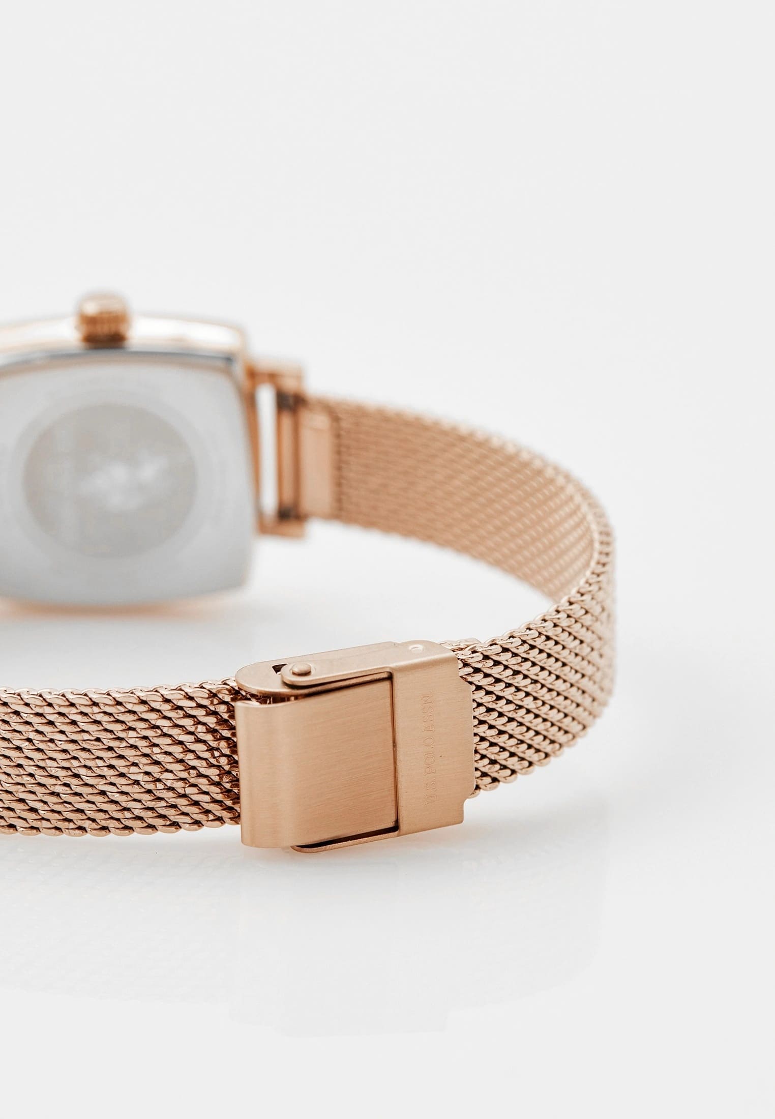 Женские наручные часы U.S. Polo Assn. Stile USPA2066-03 — это стильный и лаконичный аксессуар, выполненный в форме квадрата. Модель изготовлена из стали с PVD-покрытиемPVDУльтратонкое покрытие наносится в технике вакуумного напыления, сочетает в себе нитрид титана особой прочности со слоем золота или оксида хрома. Несёт в себе декоративную или защитную функцию. цвета розового золота, что придаёт ей благородный внешний вид и устойчивость к царапинам. Циферблат белого цвета дополнен секундной стрелкой, обеспечивающей точность отсчёта времени. Защиту циферблата обеспечивает минеральное стеклоМинеральное стеклоМинеральное стекло представляет собой искусственно выращенный минерал кварца. Такое стекло отличается особой устойчивостью к повреждениям и царапинам. Уступает по некоторым качествам сапфировому стеклу., устойчивое к мелким повреждениям. Часы оснащены кварцевым механизмом, гарантирующим точность и минимальное обслуживание. Водонепроницаемость 3 АТМ позволяет использовать часы в повседневных условиях — при мытье рук или под лёгким дождём. Браслет выполнен в технике миланской сетки из стали с покрытием розового золота и оснащён раскладным замкомРаскладной замокДанный вариант застежки используется только на часах с металлическим браслетом. Отличительная особенность такого крепления в том, что длина браслета становится универсальной и вы можете самостоятельно отрегулировать нужный вам размер – застежка просто двигается по браслету часов., обеспечивающей комфорт и уверенную фиксацию на запястье. Толщина корпуса составляет 10 мм, а его размеры — 26x26 мм, что делает часы компактными и удобными в носке. Эти часы станут универсальным аксессуаром для уверенных в себе женщин, которые ценят сочетание стиля, качества и эстетики — идеальный выбор для повседневного образа и торжественных случаев.