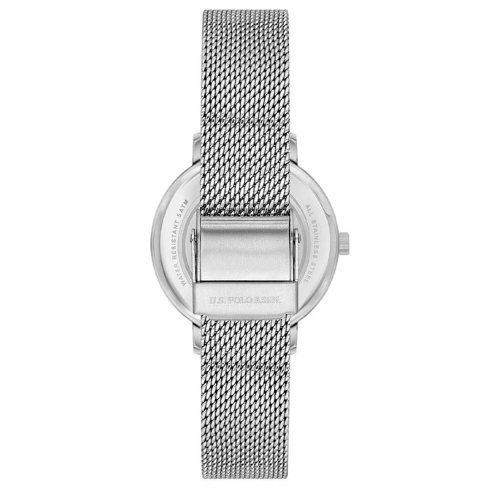 Женские часы U.S. Polo Assn. Stile USPA2079-06, кварцевый механизм с высокой точностью. Минеральное стеклоМинеральное стеклоМинеральное стекло представляет собой искусственно выращенный минерал кварца. Такое стекло отличается особой устойчивостью к повреждениям и царапинам. Уступает по некоторым качествам сапфировому стеклу. устойчивое к появлению царапин, обладающее высокой прозрачностью. Изысканный корпус изготовлен из нержавеющей стали. Лаконичные центральные часовая, минутная и секундная стрелки. Водонепроницаемость 5 АТМ позволяет использовать часы в повседневных условиях — при мытье рук или под лёгким дождём. Браслет выполнен в технике миланского плетения из стали и оснащён раскладным замкомРаскладная застёжкаТакой тип застёжки используется только на браслетах из металла. Она никогда не раскрывается полностью, происходит разделение на 2 и более частей. Раскладывающая застёжка снизит вероятность потери часов к минимуму., обеспечивающий комфорт и уверенную фиксацию на запястье, а также добавляя завершающий штрих к этому стильному аксессуару. Циферблат с кристаллами подчёркивает изысканный характер часов, создавая универсальный образ, подходящий как для повседневных ситуаций, так и для особых случаев.