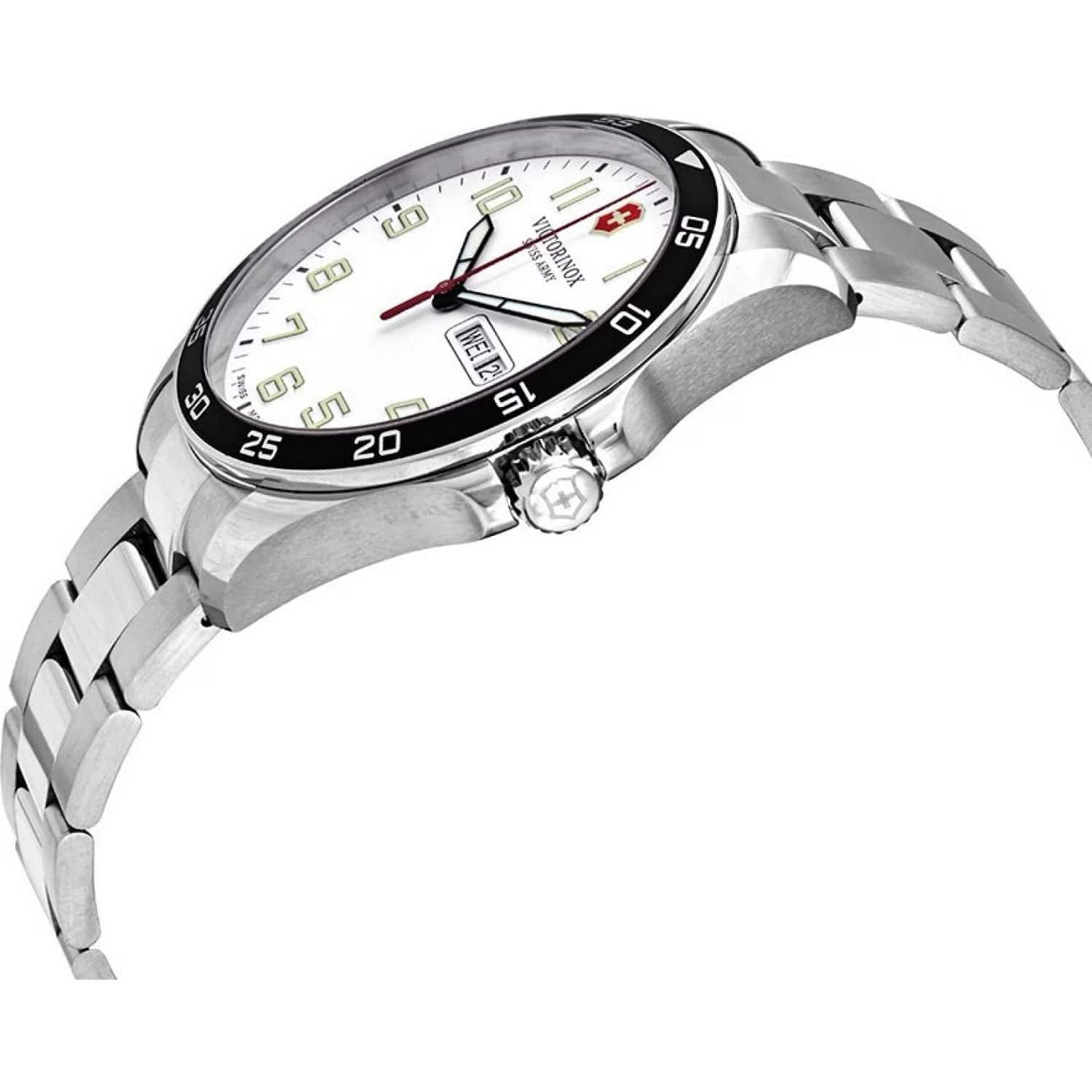 Мужские наручные часы Victorinox 241850 с надежным кварцевым механизмом. Сапфировое стеклоСапфировое стеклоПрочный и надёжный материал из кристалла сапфира синтетического происхождения, характеризующийся особой твёрдостью и устойчивостью к царапинам и повреждениям. с антибликовым покрытием. Степень водозащиты: 100 метров, позволит плавать, нырять и заниматься другими водными видами спорта. Корпус и браслет часов выполнены из нержавеющей стали. Окошки дня недели и даты находятся в положении 3 часа. Стрелки и метки с люминесцентным покрытиемЛюминесцентное покрытиеПозволяет считывать показания времени в темноте. Производители наносят на стрелки, часовые индексы, безель или поверхность циферблата светонакопительный состав, дающий холодное свечение.. Стальной браслет на застёжке-бабочке с кнопкамиЗастёжка "бабочка"Такой вид застёжки дополняется предохранителями, помогающими избежать случайного раскрытия браслета. Обладают изящным исполнением. . БезельБезельВнешний ободок, закрепляющий стекло. В спортивных часах так называется поворотное кольцо с делениями на циферблате, выполняет роль таймера – замеряет отрезки времени на шкале. Неподвижный безель – элемент декора. Однонаправленно вращающийся безель на дайверских часах позволяет фиксировать моменты погружения и выныривания на поверхность. из алюминия с PVD-покрытиемPVDУльтратонкое покрытие наносится в технике вакуумного напыления, сочетает в себе нитрид титана особой прочности со слоем золота или оксида хрома. Несёт в себе декоративную или защитную функцию..