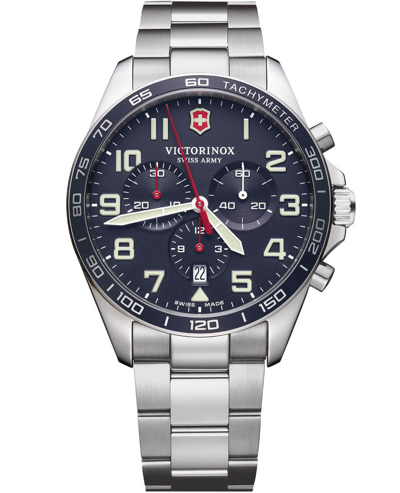 Мужские швейцарские часы-хронографХронографФункция позволяет измерять отрезки времени с особой точностью: часы, минуты, секунды. Верным признаком хронографа является наличие на циферблате 3 дополнительных окошек-счётчиков. Victorinox Fieldforce Chronograph 241857 с надёжным кварцевым механизмом. Сапфировое стеклоСапфировое стеклоПрочный и надёжный материал из кристалла сапфира синтетического происхождения, характеризующийся особой твёрдостью и устойчивостью к царапинам и повреждениям. с трёхслойным антибликовым покрытием. Корпус часов выполнен из нержавеющей стали 316L. Стальной браслет на раскладной застёжкеРаскладная застёжкаТакой тип застёжки используется только на браслетах из металла. Она никогда не раскрывается полностью, происходит разделение на 2 и более частей. Раскладывающая застёжка снизит вероятность потери часов к минимуму.. Влагозащита: 100 метров, позволит плавать, нырять и заниматься другими водными видами спорта. Окошко даты находится в положении 6 часов, стрелки и метки с люминесцентным покрытиемЛюминесцентное покрытиеПозволяет считывать показания времени в темноте. Производители наносят на стрелки, часовые индексы, безель или поверхность циферблата светонакопительный состав, дающий холодное свечение., тахиметрТахиметрРазмеченная шкала, располагается на ободке или безеле часов. Тахиметр позволяет рассчитать скорость на определённом участке пути, расстояние измеряется в километрах или милях..