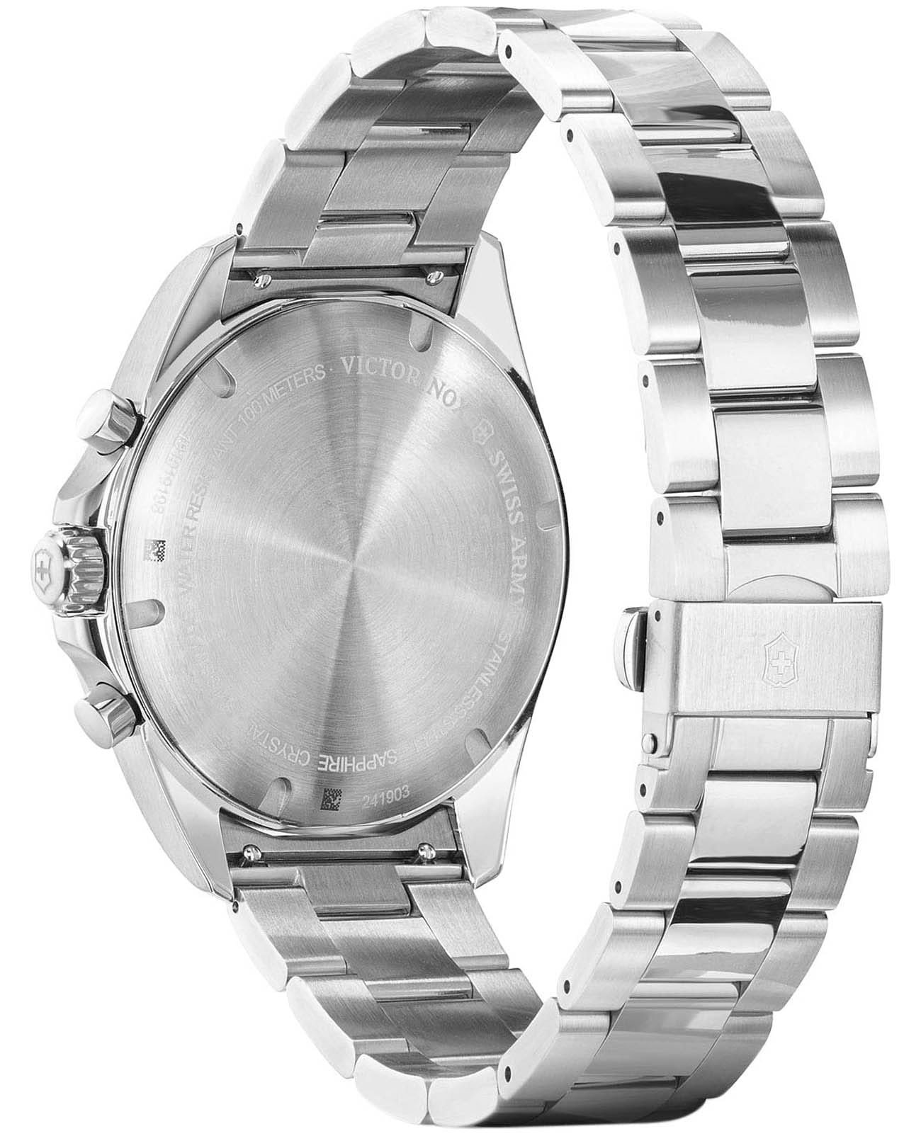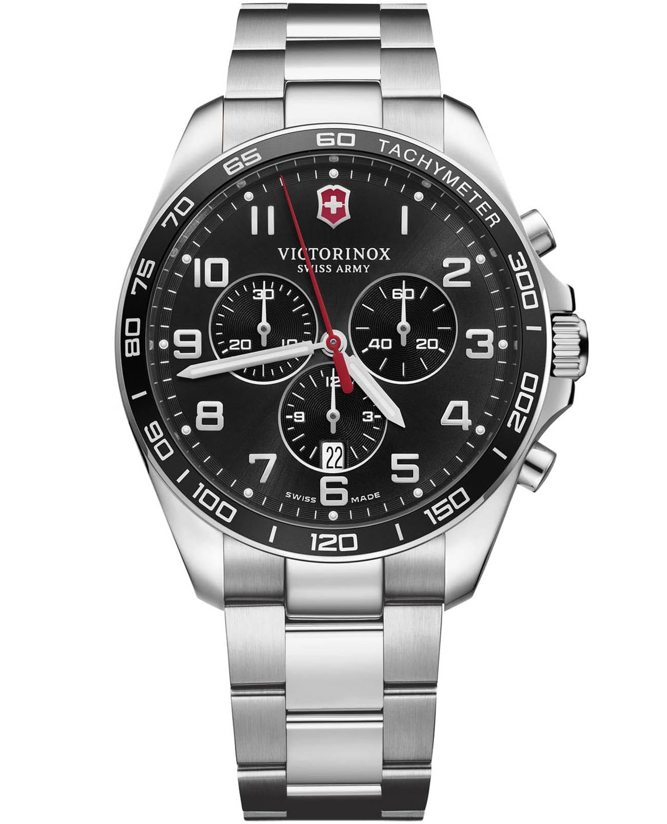 Мужские швейцарские часы-хронографХронографФункция позволяет измерять отрезки времени с особой точностью: часы, минуты, секунды. Верным признаком хронографа является наличие на циферблате 3 дополнительных окошек-счётчиков. Victorinox Fieldforce Chronograph 241899 с надёжным кварцевым механизмом. Сапфировое стеклоСапфировое стеклоПрочный и надёжный материал из кристалла сапфира синтетического происхождения, характеризующийся особой твёрдостью и устойчивостью к царапинам и повреждениям. с трёхслойным антибликовым покрытием. Корпус часов выполнен из нержавеющей стали 316L. Стальной браслет на раскладной застёжкеРаскладная застёжкаТакой тип застёжки используется только на браслетах из металла. Она никогда не раскрывается полностью, происходит разделение на 2 и более частей. Раскладывающая застёжка снизит вероятность потери часов к минимуму.. Влагозащита: 100 метров, позволит плавать, нырять и заниматься другими водными видами спорта. Окошко даты находится в положении 6 часов, стрелки и метки с люминесцентным покрытиемЛюминесцентное покрытиеПозволяет считывать показания времени в темноте. Производители наносят на стрелки, часовые индексы, безель или поверхность циферблата светонакопительный состав, дающий холодное свечение., тахиметрТахиметрРазмеченная шкала, располагается на ободке или безеле часов. Тахиметр позволяет рассчитать скорость на определённом участке пути, расстояние измеряется в километрах или милях..