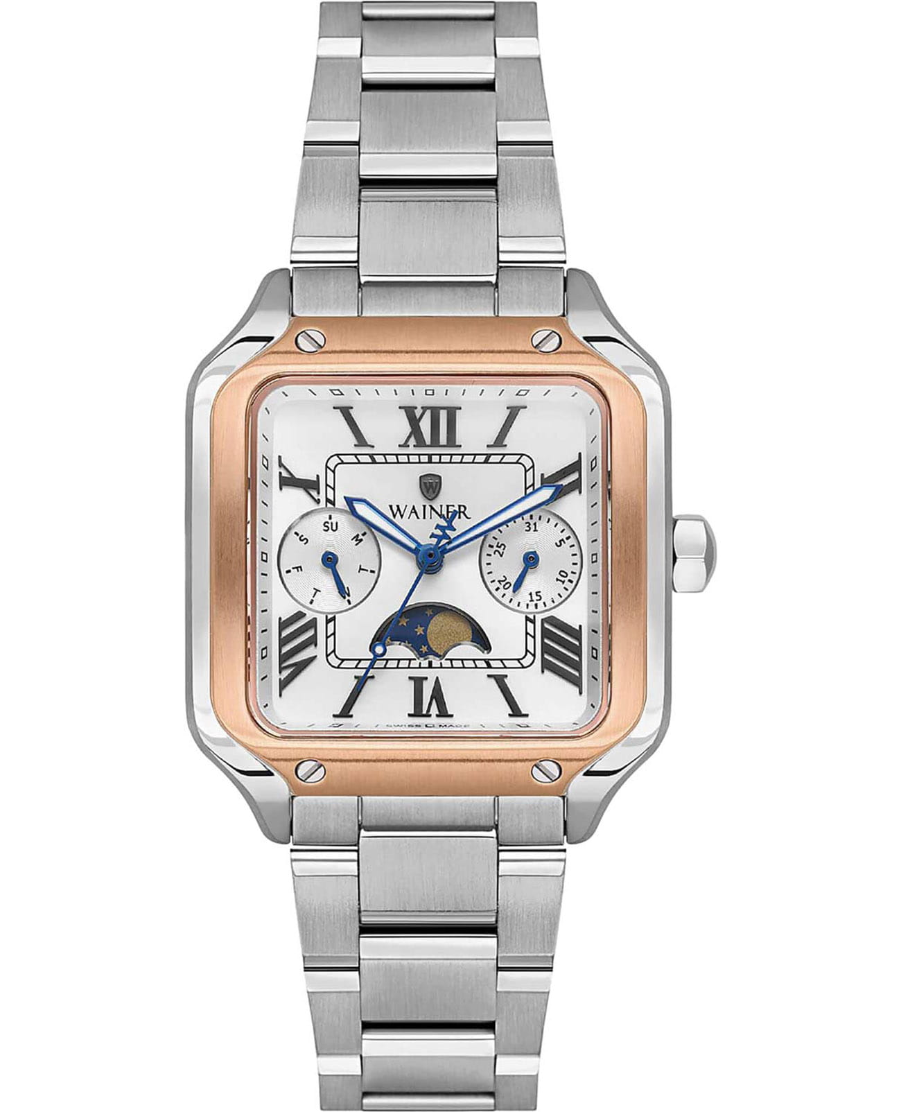 Женские кварцевые часы Wainer WA.18091-E — это стильный аксессуар, сочетающий в себе швейцарское качество и изысканный дизайн. Модель выполнена в квадратной форме из стали 316L с частичным PVD-покрытиемPVDУльтратонкое покрытие наносится в технике вакуумного напыления, сочетает в себе нитрид титана особой прочности со слоем золота или оксида хрома. Несёт в себе декоративную или защитную функцию. розового цвета, что придаёт ей благородный внешний вид и устойчивость к царапинам. Корпус украшен декоративными винтами, подчёркивая внимание к деталям. Циферблат белого цвета дополнен штриховыми метками и римскими цифрами, а секундная стрелка на конце декорирована буквой W, добавляя модели индивидуальности. Число, день недели и индикатор фазы Луны вынесены на отдельные циферблаты, что делает её функциональной и выразительной. Защиту механизма обеспечивает сапфировое стеклоСапфировое стеклоПрочный и надёжный материал из кристалла сапфира синтетического происхождения, характеризующийся особой твёрдостью и устойчивостью к царапинам и повреждениям., устойчивое к повреждениям. Гранёная заводная головка с защитой оснащена фирменным логотипом, а браслет из стали 316L шириной 16 мм оснащён Раскладная застёжкаРаскладная застёжкаТакой тип застёжки используется только на браслетах из металла. Она никогда не раскрывается полностью, происходит разделение на 2 и более частей. Раскладывающая застёжка снизит вероятность потери часов к минимуму., обеспечивающей комфорт и надёжную фиксацию на запястье. Водонепроницаемость позволяет использовать модель при мытье рук или под лёгким дождём. Стрелки с люминесцентным покрытиемЛюминесцентное покрытиеПозволяет считывать показания времени в темноте. Производители наносят на стрелки, часовые индексы, безель или поверхность циферблата светонакопительный состав, дающий холодное свечение. обеспечивают отличную читаемость даже в условиях слабого освещения. Механизм калибра Ronda 706.1 гарантирует точность хода и надёжность. Эти часы станут универсальным аксессуаром для тех, кто ценит сочетание стиля, функциональности и швейцарского мастерства — идеальный выбор для повседневной носки и торжественных случаев.