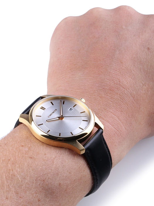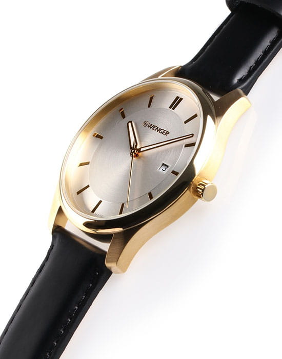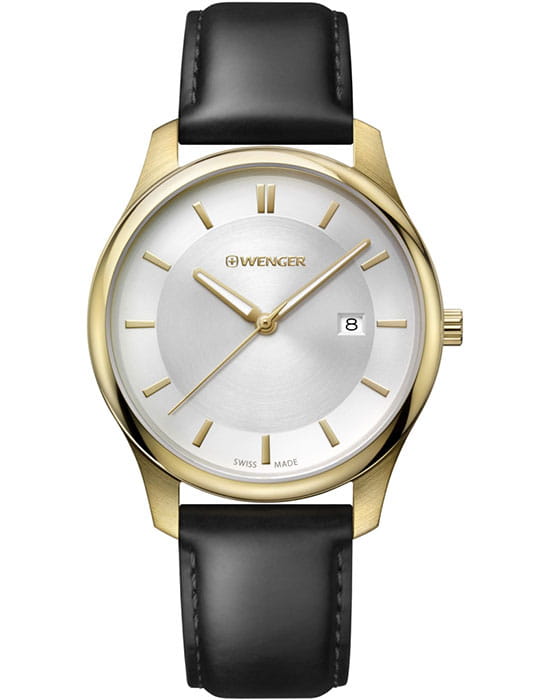 Мужские швейцарские часы с календарём Wenger 01.1441.106, кварцевый механизм с высокой точностью. Класс водозащиты: 30 метров, позволит защитить корпус от случайных брызг или капель дождя. Корпус часов изготовлен из стали, золотистого цвета.